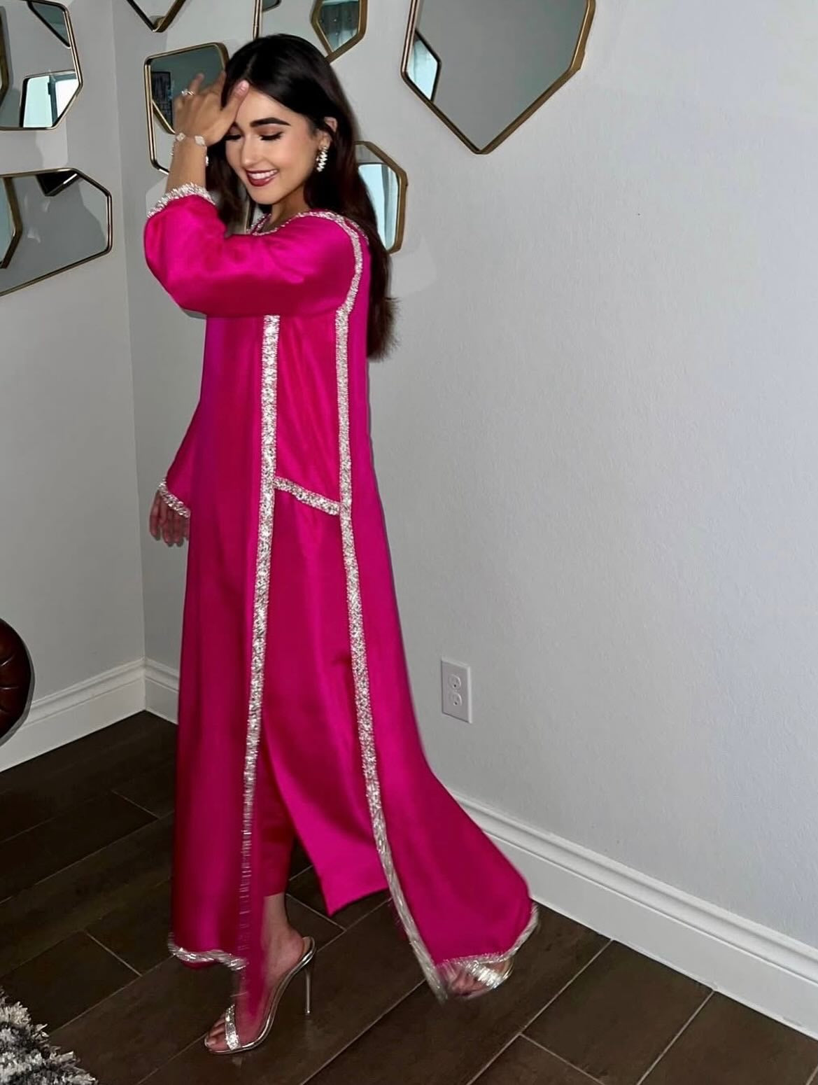 Paired with statement heels, an embellished clutch, and elegant jewelry, this outfit is ideal for Eid gatherings, festive dinners, and special family celebrations. Effortlessly refined and celebration-ready, it captures the essence of festive elegance with a polished finish — a stunning Eid dress for making a memorable impression.